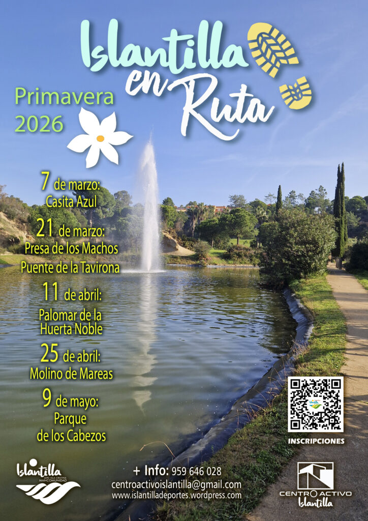 Vuelve ‘Islantilla en Ruta’ Con el cambio de estación, ponemos en marcha el programa de senderismo del ‘Servicio de Deportes de Mancomunidad de Islantilla’, en su edición Primavera 2026, que nos llevará a conocer nuestro entorno natural más cercano, visitando lugares que forman parte de nuestro patrimonio arquitectónico, histórico y cultural, alguno calificado como Bien…