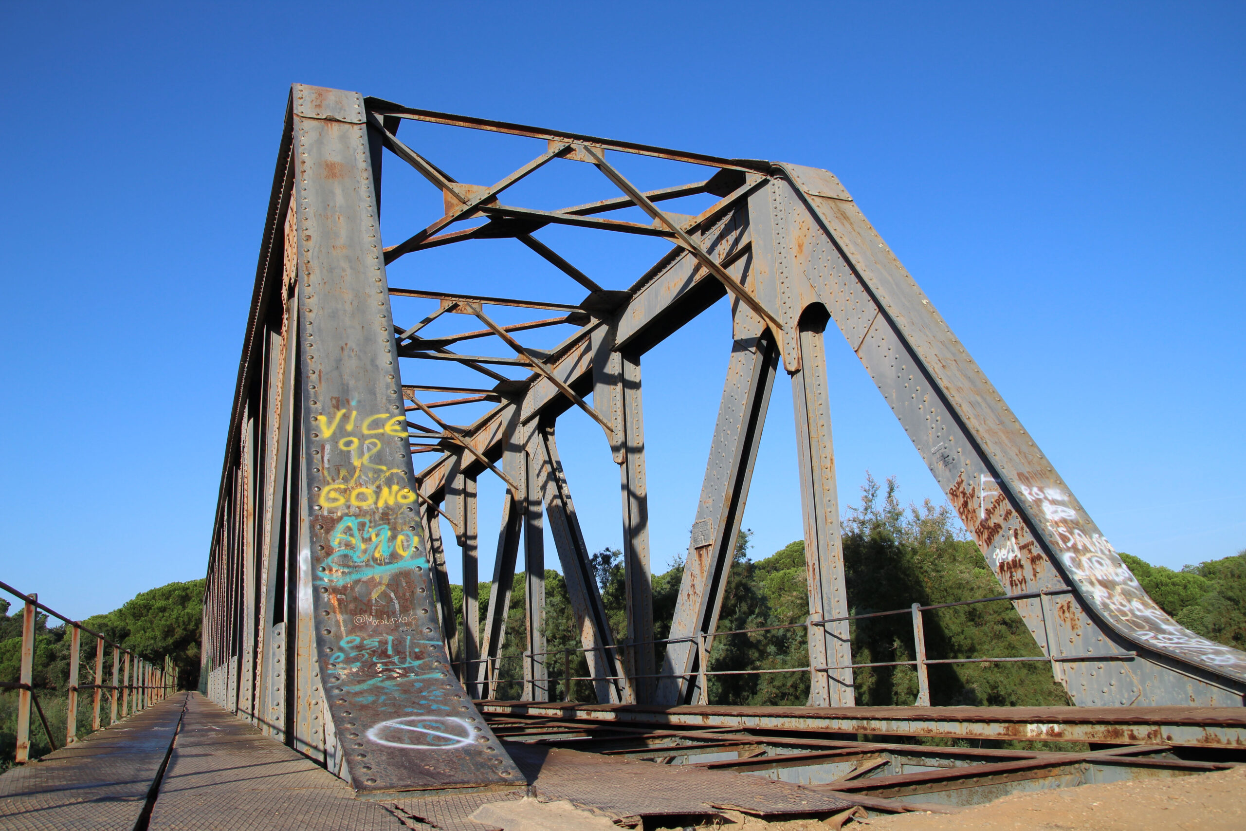 Partiremos desde la Presa de los Machos, cuyo embalse se encuentra sobre el Río Piedras. Es el quinto por capacidad de los situados en la Demarcación Hidrográfica Tinto, Odiel y Piedras y fue inaugurado el 2 de mayo de 1988. La superficie del embalse es de 275 ha, incluidas en los términos municipales de Lepe y Cartaya. Bajando por el río llegaremos al Puente de la Tavirona, puente de hierro, que cruza el río Piedras, fue zona de paso del ferrocarril de la línea de Huelva a Ayamonte por Gibraleón, construido con los restos de un antiguo vagón de tren en 1931. Es una obra de ingeniería de 80 metros en dos tramos metálicos de 40 metros para franquear el Río Piedras a la altura del lugar que le da nombre al puente. En 1990 se adaptó a Vía Verde Litoral, que se traza a lo largo de la antigua vía ferroviaria, pasando junto a los Parajes Naturales de las Marismas del Odiel, Marismas de Ayamonte e Isla Cristina, y de las Marismas del Río Piedras y la Flecha del Rompido. En la actualidad se puede cruzar a pie, en bicicleta y a caballo. Es un lugar desde donde se puede apreciar una extensa panorámica del «Paraje Natural Marismas del Río Piedras y Flecha de El Rompido».