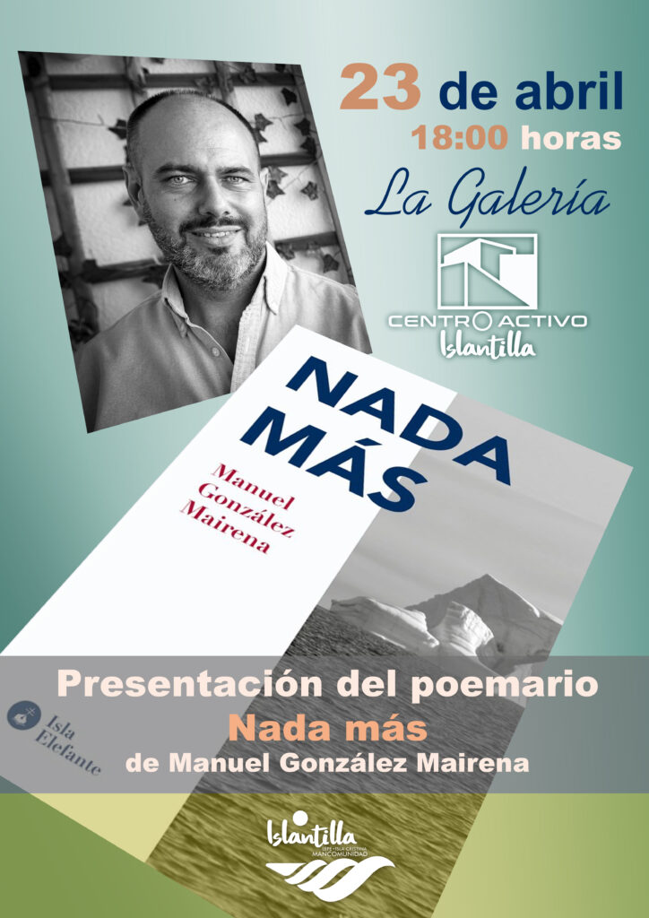 – 18:30 horas. Encuentro con el escritor Manuel González Mairena en la presentación de su poemario Nada más, con la participación de los miembros del Círculo de Lectura Biblioteca ‘Luis Ciges’. La Galería, Centro Activo de Islantilla.