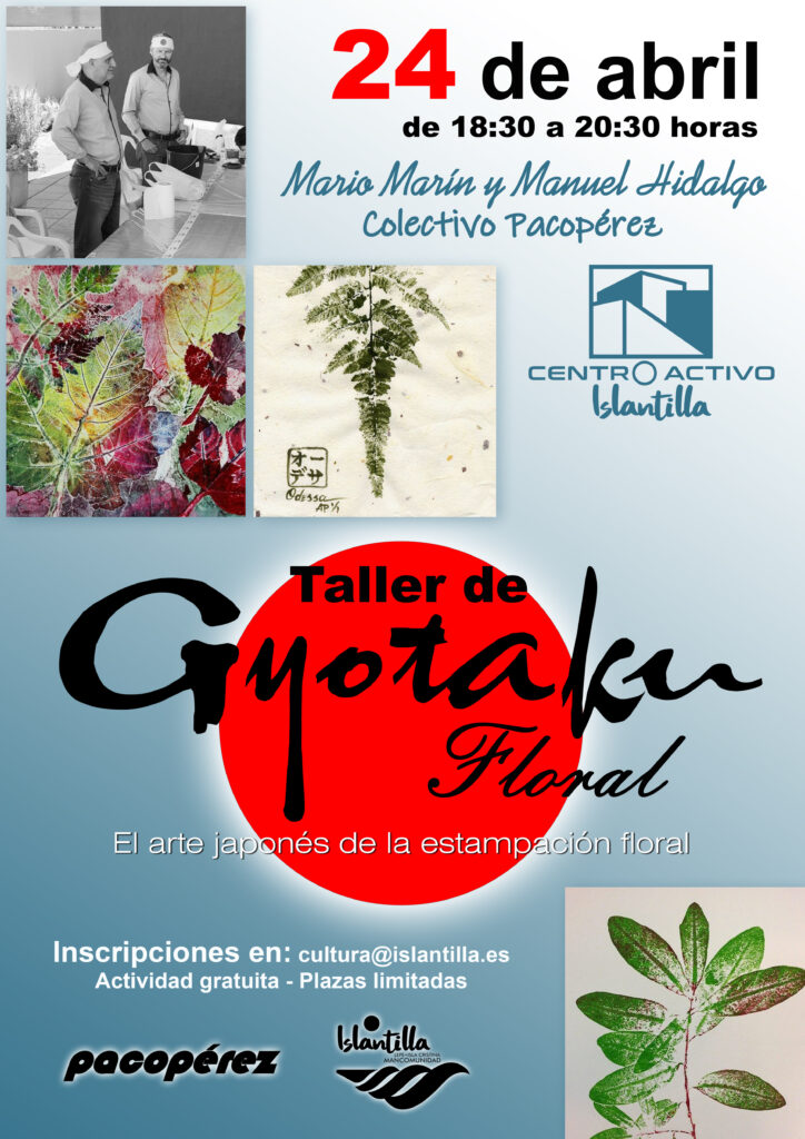 – De 18:30 a 20:30 horas: Taller de ‘Gyotaku floral‘. El arte milenario japonés de la estampación vegetal, taller a cargo del Colectivo Pacopérez. Patio del Centro Activo de Islantilla.