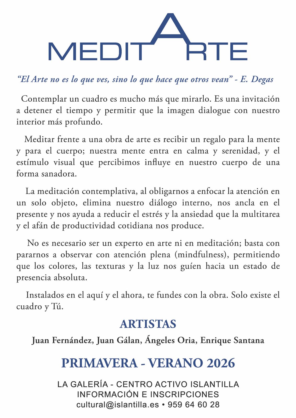 El Proyecto MeditArte programará hasta junio sesiones de mindfulness a través de la contemplación de obras plásticas cedidas a La Galería del Centro Activo de Islantilla. La Sala de Prensa …